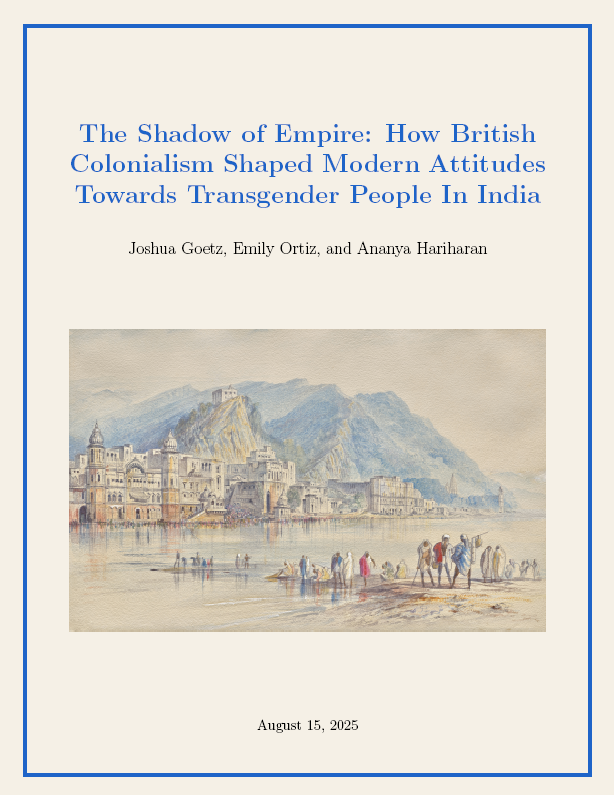 In this report, 2024-25 LCHP Grantees Joshua Goetz, Emily Ortiz, and Ananya Hariahrain consider the ways that British colonialism impacted attitudes in India towards transgender people, with ramifications extending into the modern world. Through historical and quantitative analysis, the authors contextualize the problem and its modern ramifications through interviews with community-based organizations and transgender people in India.